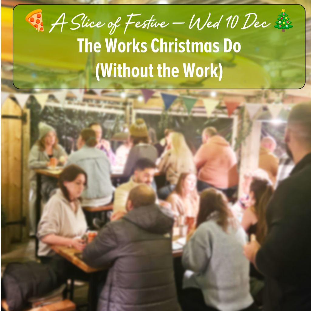 Be greeted with mulled wine on arrival, nibble on breadsticks with dips and pigs in blankets with honey-mustard glaze, then enjoy eat-as-much-as-you-can festive pizzas served fresh from the stone oven: Gorgonzola, Char-Grilled Aubergine & Pancetta Hazelnut, Feta & Rocket on Beetroot Base (Vegetarian with vegan option) Pig & Olive – slow-cooked pulled pork, signature Mushroom & Spinach – creamy and comforting (Vegetarian with vegan option) 🕡 Arrival from 6:30 pm · First pizza 7:00 pm A Slice of Festive – Works Christmas Do (without the work!)
